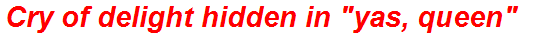 Remember, the answer must not only be hidden within “yas, queen,” but it must also be a valid “cry of delight.” Test your potential solutions against this criteria. Would someone actually exclaim this word or phrase in a moment of joyous elation? Is it a natural expression of positive emotion?