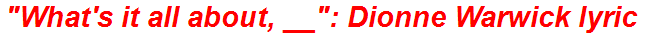know, some clues are straightforward, some are pure wordplay genius, and then there are those that tap into the deepest reservoirs of pop culture knowledge. The moment I saw “‘What’s it all about, __’: Dionne Warwick lyric,” a familiar melody instantly began to play in my mind, a timeless classic from an artist whose voice is pure liquid gold.