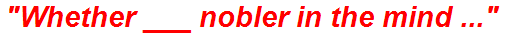 “Whether ___ nobler in the mind to suffer the slings and arrows of outrageous fortune, or to take arms against a sea of troubles and by opposing end them?”